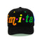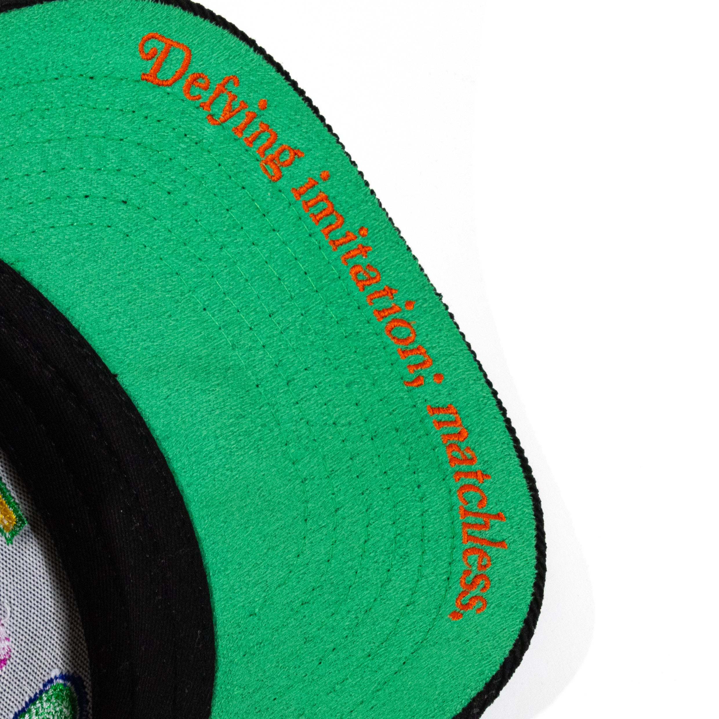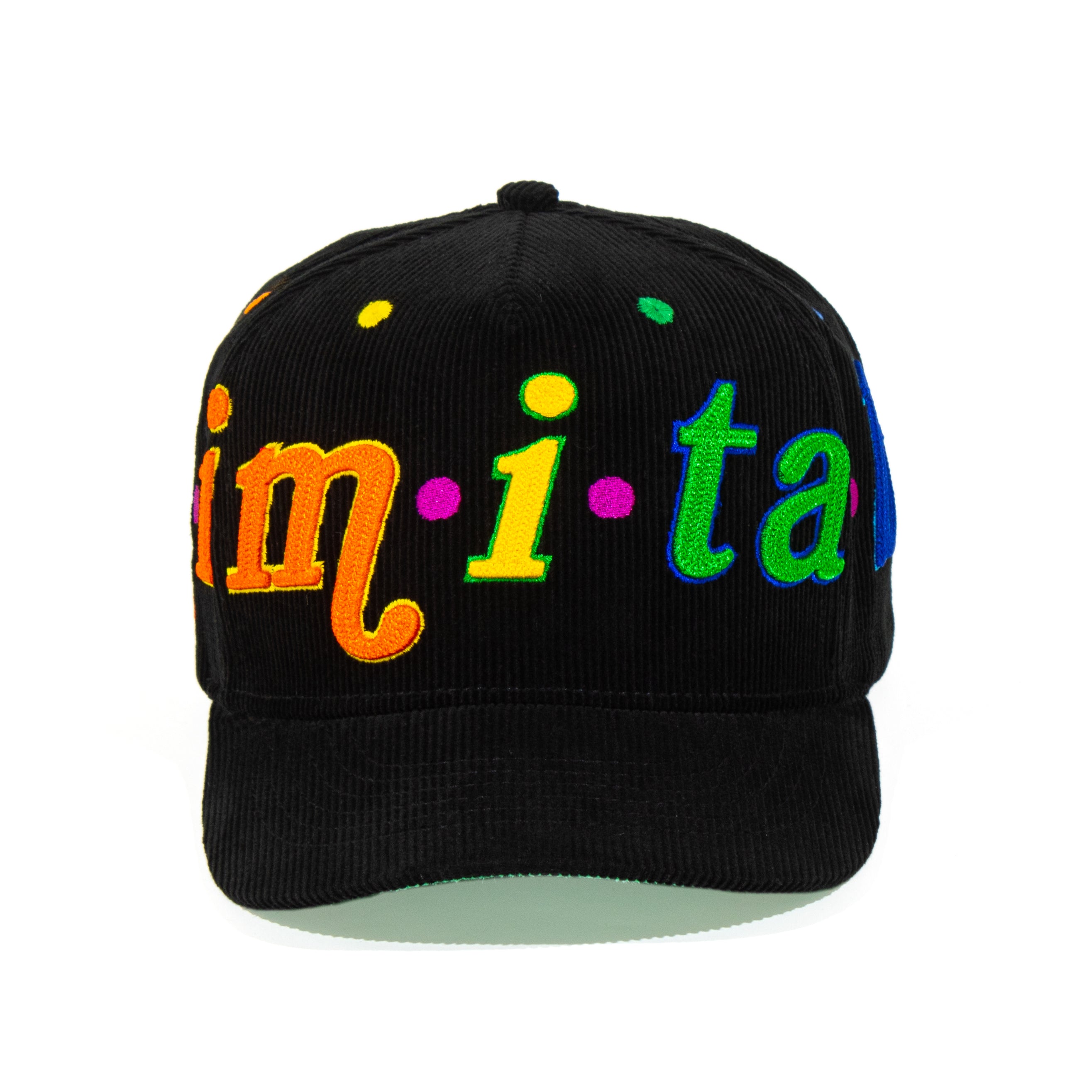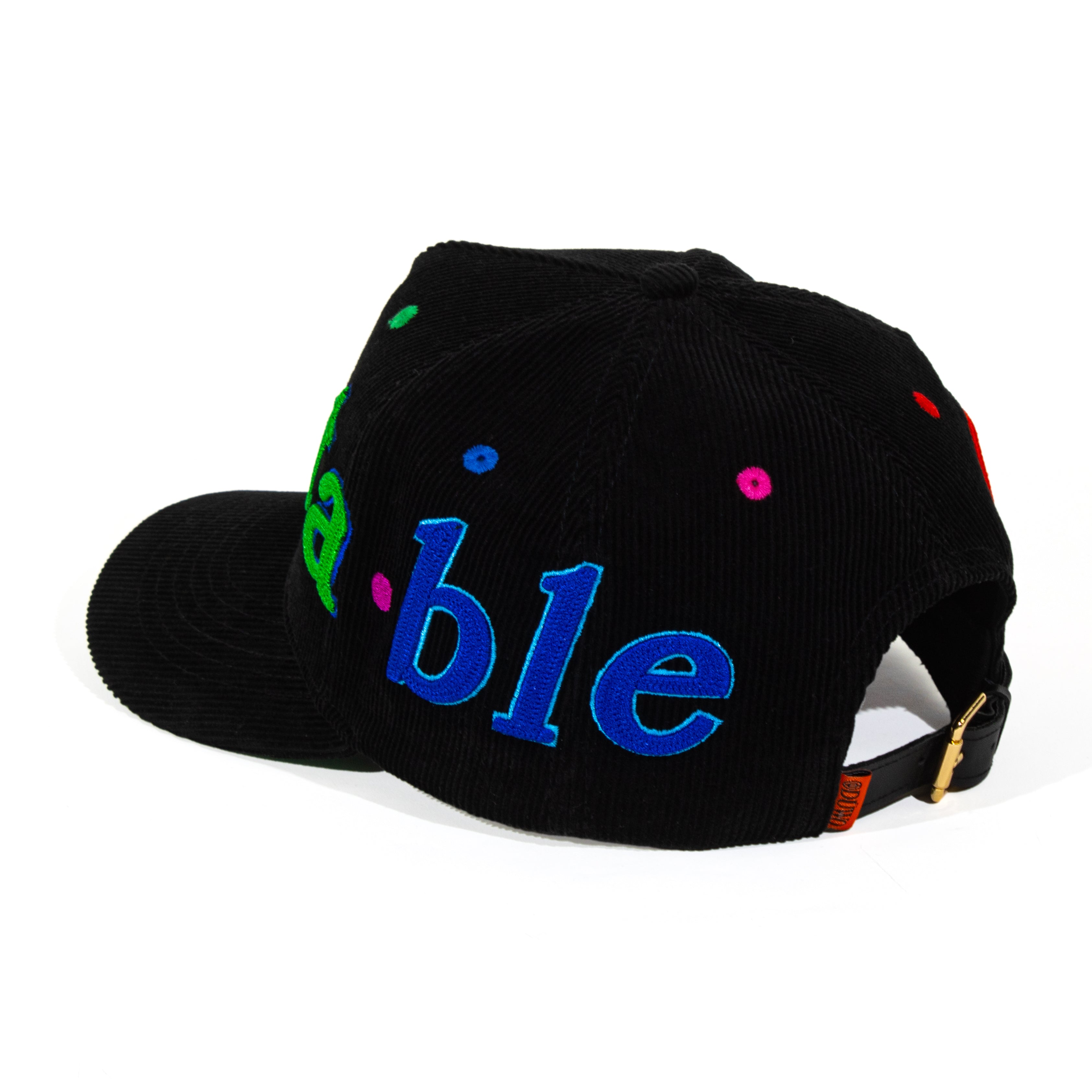 Black corduroy, wrapped in full 3D embroidery — each letter rendered in rich, saturated color. Under the brim, a green suede underlayer carries the definition: